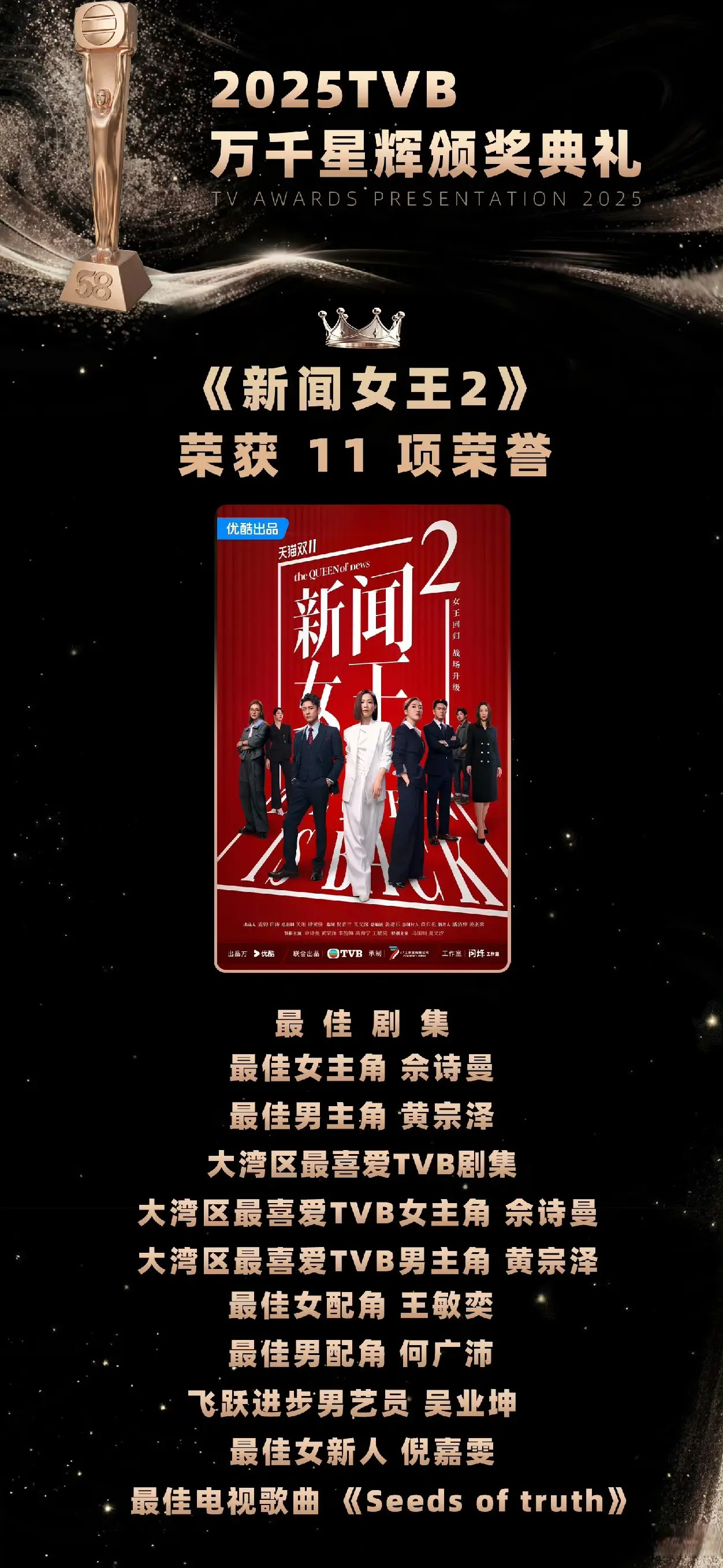 此次颁奖礼上,《新闻女王2》几乎承包了所有核心奖项: